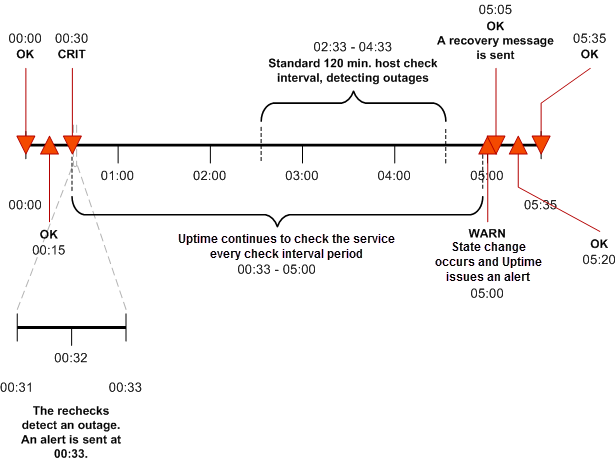 Uptime Infrastructure Monitor encounters a critical error on a host. Uptime Infrastructure Monitor performs three rechecks at one minute intervals–all of which return a critical error–and then sends an alert after the third recheck.