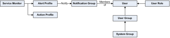 An Alert Profile can send an alert via email, or to a pager or a cell phone. You can configure any or all of these actions to occur simultaneously by associating the Alert Profile to multiple Notification Groups. For example, if a Web server process stops responding, both the system administrator and Web server administrator can be notified.