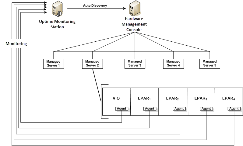 In this configuration, the HMC manages all I/O requests from the LPARs. Use the Auto Discovery feature to detect the managed servers and add them to Uptime Infrastructure Monitor. Through the HMC, Uptime Infrastructure Monitor polls the agents installed on the VIO and the LPARs on a pSeries server for workload and other data, as illustrated below: