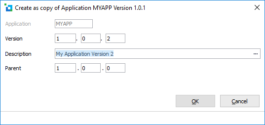 Parent | The parent Version is automatically derived based on the parent of the copied Version. For the first Version in an Application the Parent will be 0.0.0. The Parent Version indicates the prerequisite Version when installing. |