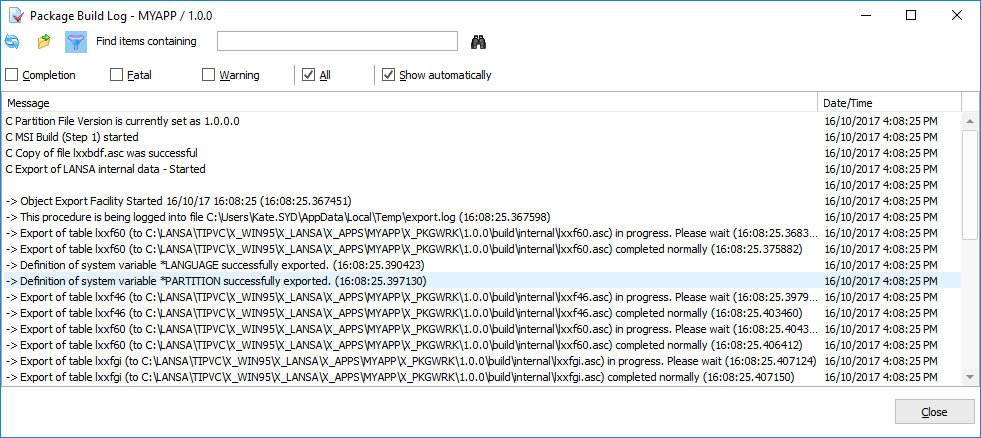 The actual log file associated with this dialog, lpcreate.log, is stored in the corresponding package directory, <sysdir>\X_Apps\<Application>\X_PKGWRK\<Version>\Build\dpcreate.log Details of any export logs generated during the build process are automatically incorporated into the lpcreate.log and identified by a prefix of ->.