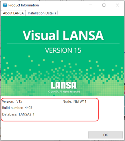The About LANSA tab presents summary information about the LANSA software version as well as the current user and database information.