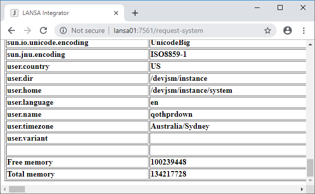 The console system information displays the JVM system properties, but also the free and total memory amounts are displayed.