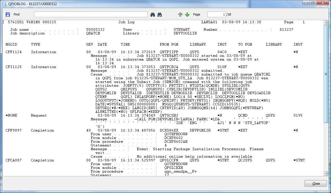 Any job logs created on the master for check in jobs can be viewed in the Check In Joblog Viewer. The whole file is downloaded to Visual LANSA and displayed to you one page at a time.
