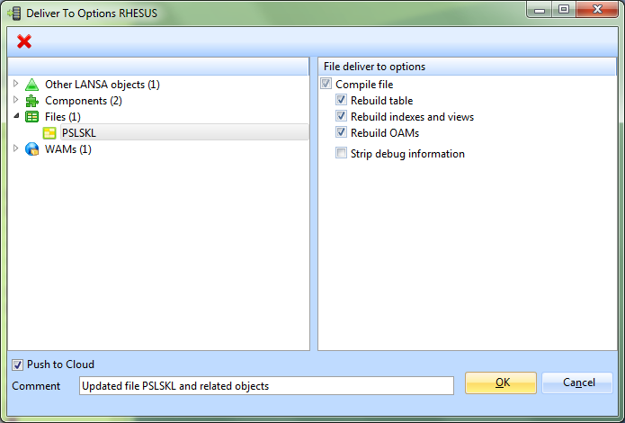 When delivering to IBM i, these options correspond with the Check In options. For example, the following dialog will appear when delivering in a File to an IBM i: