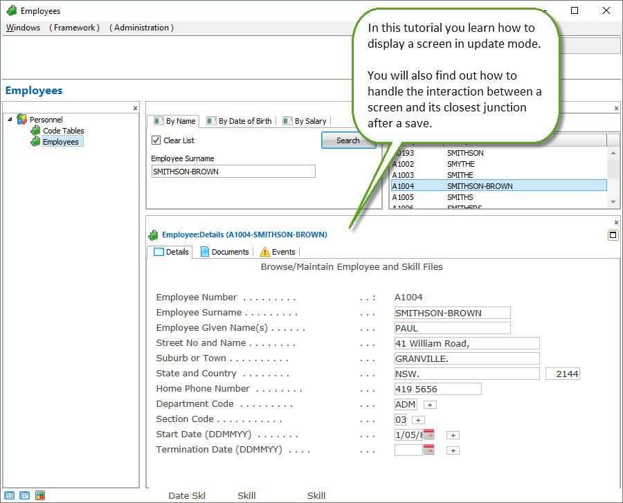 In this tutorial you will change the EmployeeDetails screen to update mode to allow changes.