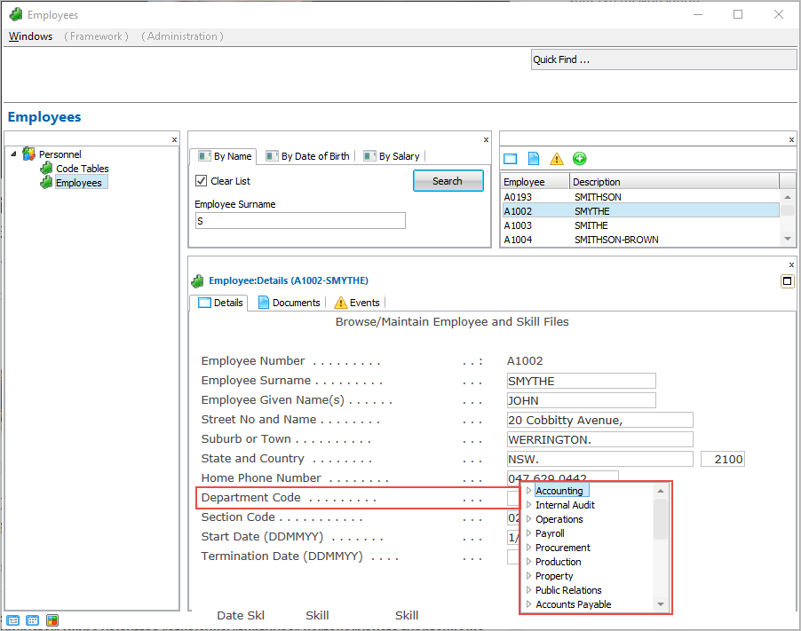 3.   Put the cursor on the Department Code field and press F2 to display the special field handler: