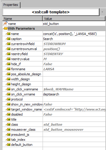 Change the caption property to Search and the on_click_wrname property to deptsearch. This indicates that when the push button is clicked on the resulting web page, a webroutine deptsearch (defined in the current WAM) will be executed. Note that this webroutine is currently not defined so it must be added to the WAM before the push button will execute correctly.