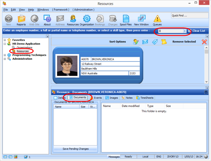2. Select the HR Demo Application and then select the Resources business object. Enter B in the mini filter in the toolbar and press Enter to display employees in the Instance list. Select employee BROWN, VERONICA, A0070.