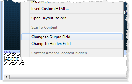 Note: You can change the display mode of a field at any time in the Design view by right clicking the field and selecting Change to Input Field, Change to Output Field, or Change to Hidden Field, without having to change the WEB_MAP.However, note that if you want to map the field into the WebRoutine, the Web_Map must have a