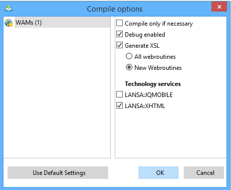 The compile options selected are retained for future compiles, with the exception of the XSL Generation, which is always set to only generate New webroutines as a safeguard.