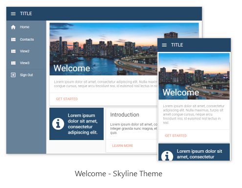 2つの異なるテーマを持つホーム画面のアプリケーションテンプレートは、問い合わせページ、問い合わせ先リスト、グラフ、リンクのビューなどと併せて、ホームページ付きのアプリケーションを作成します。