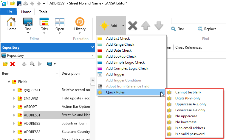 テーブルにのみ使用可能であった、あらかじめ定義されたクイックルールがフィールドにも使用可能になりました。項目にルールを追加するのに必要な労力を最小限にするために、クイックルールを使用します。