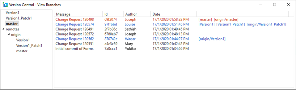 [ブランチを見る]のアクションで全てのローカル/リモートのブランチを表示し、現在のリポジトリでの全てのコミットを確認することができます。以下のようなアクションを取るのに使用することができます。新しいブランチの作成ブランチのチェックアウトブランチのマージブランチのリベース詳しくは、『Visual LANSA ユーザーガイド』の「マージ」および「リベース」を参照してください。