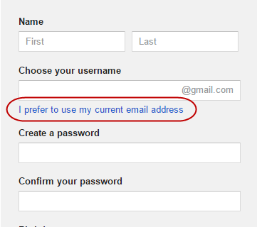 [代わりに現在のメールアドレスを使用] のリンクをクリックすると、(新規の Gmail アカウントを作成する代わりに) 会社の電子メール・アドレスを入力することができます。