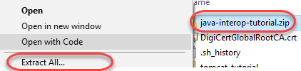 Windows エクスプローラーから java-interop-tutorial.zip で右クリックし、[すべて展開(T)...] を選択します。