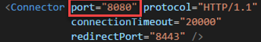 構成ファイルのポート番号を確認/変更する際に、HTTP リスナー・ポート番号を確認するようにしてください。このポート番号は、後ほど自身の RDML コード内に指定する必要があります (HTTP ポート番号は、プロパティ protocol="HTTP/1.1" のノード Connector にあります)。