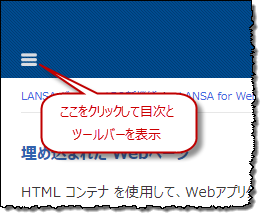 ツールバーとホーム・ボタンが表示されない場合多くの場合、ページの上下に表示されるハンバーガー・アイコン ([目次を表示]) を使って、目次を表示することができます。