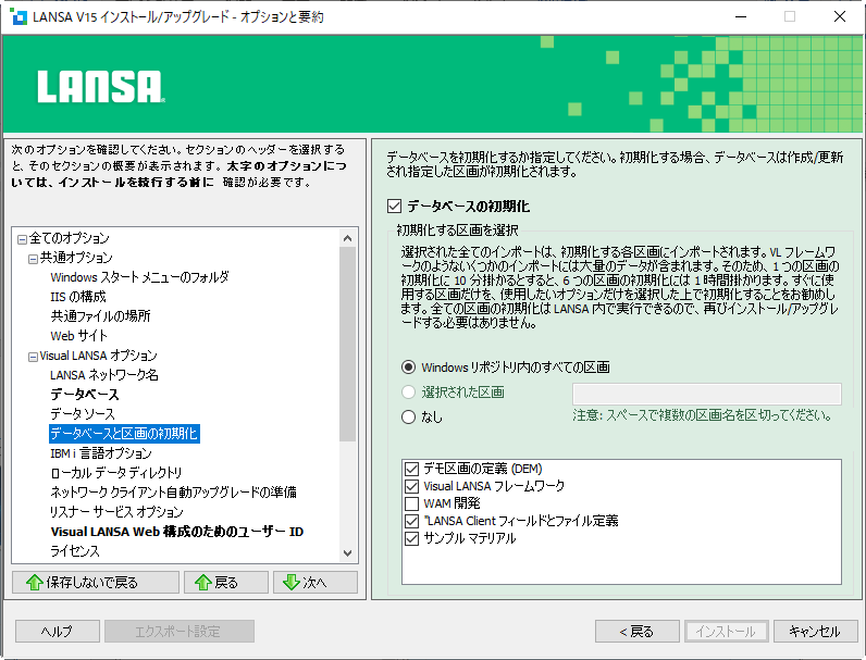 初期化に時間がかかることを避けるため、すぐに使用する区画だけを初期化し、すべての区画で使用するオプションだけを選択してください。例えば、大量のデータを含む Visual LANSAフレームワークをインポートするとします。この場合、1つの区画の初期化に10分かかるとすると、6区画では1時間かかります。後ほど LANSA 内から区画を初期化することもできるので、ここですべてをインストールしたり、インストールを再度実行する必要はありません。