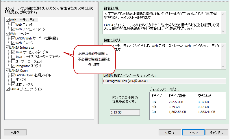 3. [機能] ダイアログでインストールする製品を選択し ( ü )、Web ユーティリティなどインストールしない製品の選択を解除します。