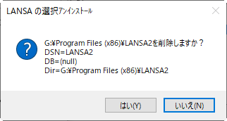 削除される主要なLANSAシステム・パーツが記載されたメッセージが表示されます。以下のように ODBC DSN と LANSA ルート・ディレクトリが記載されています。