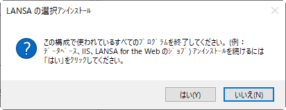 1. [アンストール] ボタンをクリックして、次のダイアログで上に示される [アンイストール] ボタンを押すと、[LANSA 選択アンイストール] ダイアログが開きます。