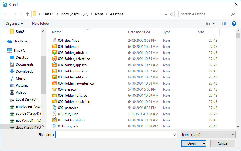 パスとアイコン名を入力するか、ボタンを使用してプロンプトを表示すると、アプリケーションで使用するアイコンを検索する共通ファイルのダイアログが開きます。