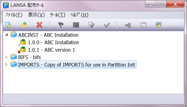 配布ツールを開くと、メイン・ウィンドウが起動します。既存の配布ツールのアプリケーションとその中にあるパッケージがツリー形式で表示されます。
