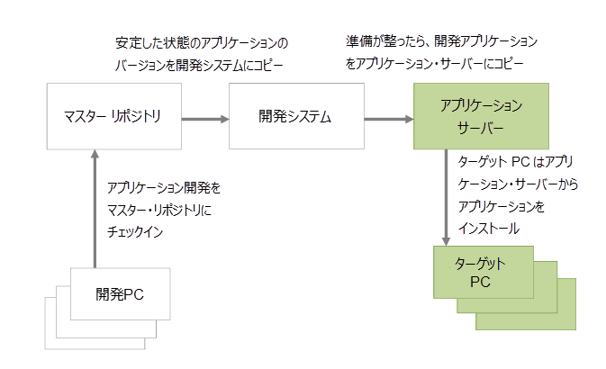 アプリケーション・サーバーをJIT処理に使用する場合、導入先PCからのアップグレードの要求を待ってから、導入先PCにパッケージを必要に応じてインストールします。