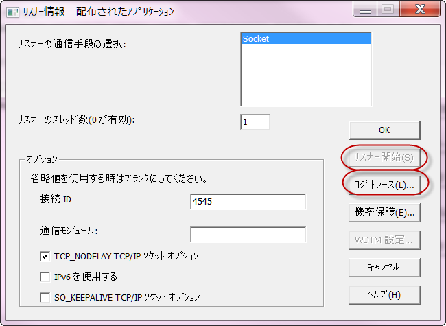 2 アプリケーション・サーバーのリスナーに対する追跡機能を有効にする | [ログ トレース]ボタンをクリックします。 トレース・パネルで[標準の選択]ボタンを選択して[OK]をクリックします。 リスナーを停止してから再起動します。 コミュニケーション管理機能を閉じます。 |