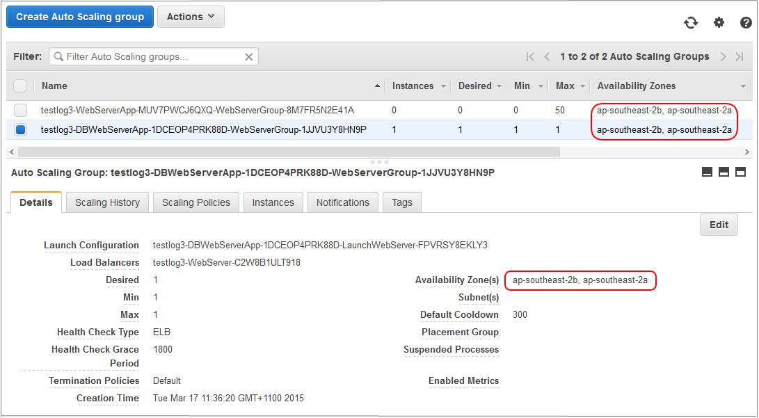 - 次に EC2 AWS コンソール・ページにリストされている Auto Scaling グループに進みます。以下のように Auto Scaling グループの両方が複数の AZ にあることが分かります。