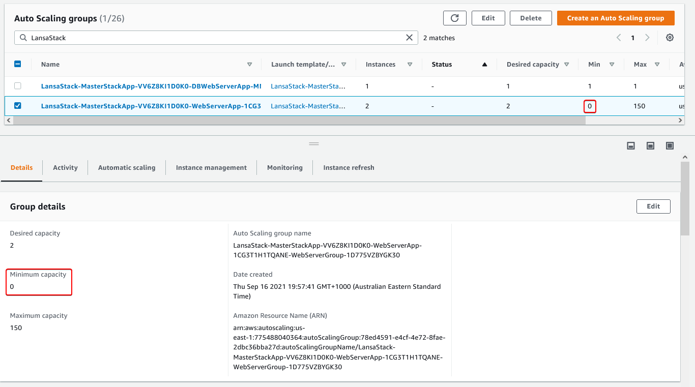 1. Auto Scaling グループのウインドウに戻ります。Auto Scaling グループの LansaStack-WebServer を選択し、詳細タブ、次に編集をクリックします。これはステップ 1 で行った手順と同じです。