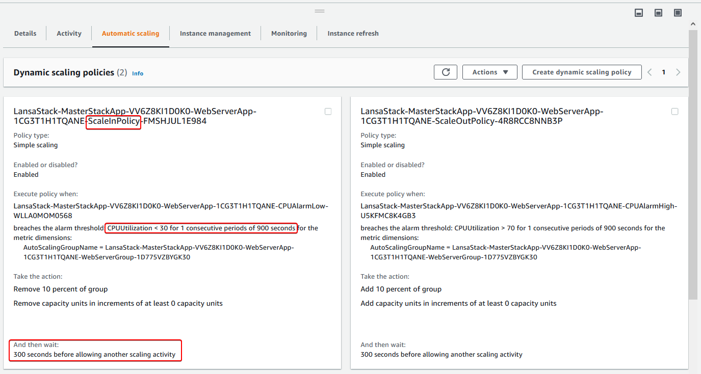3. Automatic scaling  タブをクリックします。ポリシー名は非常に長い名前になっています。この名前の真ん中あたりに、ScaleInPolicy という名前のポリシーが確認できると思います。このポリシーは、900 秒あたりの CPU の使用率が 30% より低い数値に落ちた時に実行できるよう、設定されています。このような状況になった場合、I インスタンスが Auto Scaling グループから削除されます。そして、5 分間の休止の後、別のスケーリング活動が許可されます。これは、インスタンスの開始・停止が頻繁に繰り返されるのを防ぐためです。実際、実稼働システムでは実行ポリシーはより長い期間の平均である可能性が高いので、アイドル時間の差は均等になります。