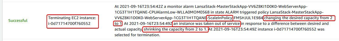 7. これまでに発生した、別のスケーリング活動を調べることも可能です。自身のユーザー要求を表示して、強制的に 2 件の Web サーバー・インスタンスを作成、ASG をスケールアウトして、2 件の自動スケーリング・イベントを ASG でスケールインすることもできます。