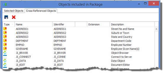 - バージョン1に含まれていたオブジェクトを確認するには、ツールバーの相互参照ボタン をクリックし、[クロスリファレンスオブジェクト]タブを選択すると、すべてのオブジェクトの一覧が表示されます。