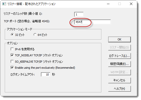 リスナーの接続 ID (ポート番号) を設定します。適切な値は、ターゲット PC や Windows サーバーで既に定義されているその他のリスナーによって異なります。この演習では、デスクトップにインストールします。恐らく Visual LANSA リスナーは、デフォルト値の 4545 に設定されているでしょう。JIT サーバーに対しては、この値を 4547 もしくは適切な値に設定します。