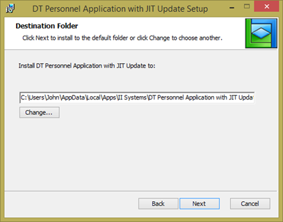 アプリケーションは以下のような場所にインストールされます。C:\Users\John\AppData\Local\Apps\II Systems\II Client Personnel Application with JIT Update\X_Win95\X_Lansa\X_Apps\dtcltjit - 導入先フォルダのダイアログでは、必要に応じて導入先のフォルダを変更できます。