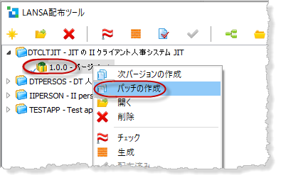 - 配布ツールを開き、アプリケーション IICLTJIT を選択します。バージョン 1 を選択し、コンテキスト メニューから [パッチの作成] を選択します。