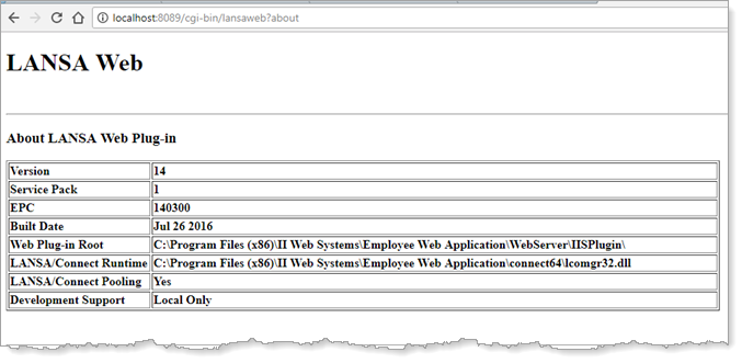 http://localhost:8089/cgi-bin/lansaweb?aboutポート番号は自身の配布アプリケーション用に調整してください。以下に示すような情報が表示される場合、LANSA の Web ジョブが実行されています。この場合、インストールしたシステムにより Web ジョブが実行されていることになりますが、アプリケーションが実行されている訳ではありません。配布システムにより Web アプリケーションがサポートされていますが、配布アプリケーションに何らかの問題があるということです。 - モバイル Web アプリケーションを実行しログインも可能なのに、連絡先リストが空の場合。