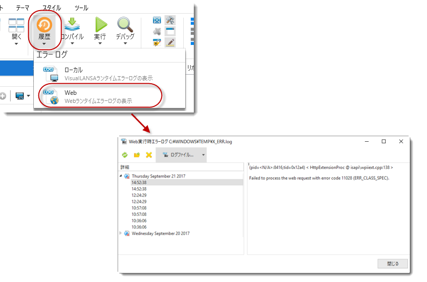 Web コンポーネントは実行されていますが、サーバー・モジュールでデータベース・ファイルからデータが取得されていません。このような場合、Microsoft SQL Server Management Studioを使って、データベースに必要なアプリケーション・テーブルが含まれているか、さらにそのテーブルにデータが入っているかを確認します。 - Web アプリケーションがローカルで実行されている状態で、Visual LANSA から LANSA Web ジョブのジョブログを取得できます。エラーログは [実行履歴] からアクセスできます。