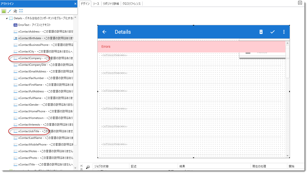 - [デザイン] タブが表示されています。[アウトライン] タブを開くと、Details という名前のパネルに、連絡先データが編集フィールドとして表示されます。フィールド xContactJobTitle と xContactCompany 表示位置を置き換えるという簡単な変更を追加します。
