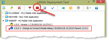 - [ツール] リボンから、[配布ツール] を開きます。アプリケーション WEBAPP の V1.0.0 - バージョン 1 パッケージを選択します。コンテキストメニューから [パッチの作成] を選択します。