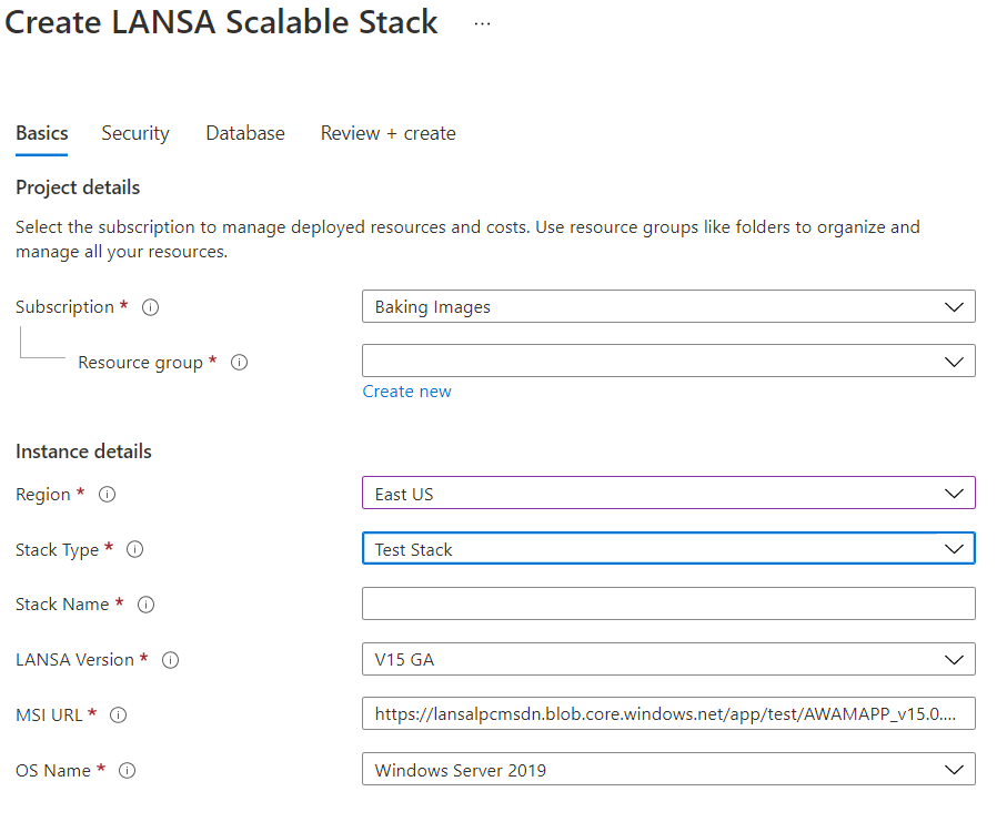 • MSI URL は、以前の手順で保存した MSI の URL です。ここに貼り付けます。または、LANSA スケーラブル・スタックのテストとして、デフォルトの MSI の使用を選択することもできます。