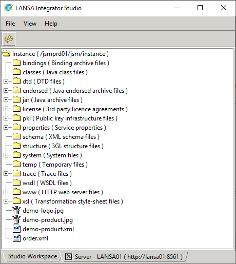 スタジオで JSM サーバーのインスタンス ディレクトリの内容を表示できます。スタジオを使用すると、ローカルのマシンとJSMインスタンス ファイルをやりとりできます。