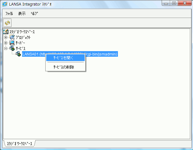 [スタジオ ワークスペース] パネルで開くサービスを選択してダブルクリックするか、ポップアップ・メニューを使用してサービスを開きます。