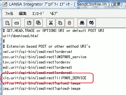 - uri のエントリーを探し、下の画像に示されているようにxls.uri=/cgi-bin . . .のエントリーを修正します。これは、xlsファイルを処理する際に呼び出すプログラムやファンクションを見つける場合にJSMがDC@W29で検索するサービスを定義します。