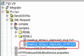- Integrator スタジオのプロジェクトに切り替えます。ソリューションXML 要求で samples/RDMLX フォルダを展開し、スタジオのテキスト・エディターで SAMPLES_RDMLX_INBOUND_HTTP.TXT を開きます。テキスト・エディターはSAMPLES_RDMLX_INBOUND_HTTP.TXTをダブルクリックするだけで開きます。