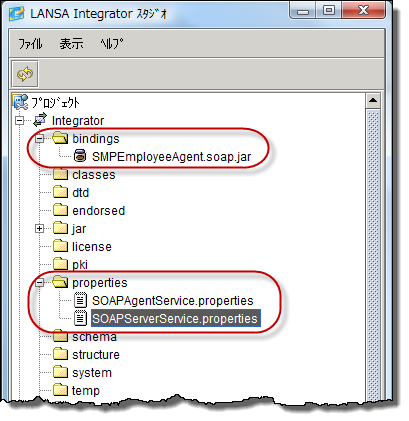 これで、jar ファイルは、JSM サーバーの bindings フォルダに移動します。 - Integrator/Properties フォルダの SOAPAgentService .properties ファイルを右クリックしてコンテキスト・メニューを開きます。