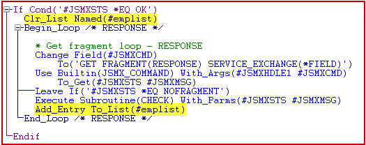 コマンド GET FRAGMENT(RESPONSE) SERVICE_EXCHANGE(*FIELD) は、返されたフィールドをプログラム変数にマッピングします。つまり、このループ内で、フォームのリスト・ビューにエントリーを追加できます。完了したコードは以下のようになります。
