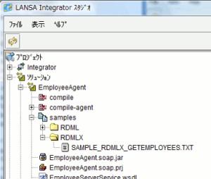 2. Integrator スタジオでプロジェクト "iii SOAP チュートリアル" を開きます。EmployeeAgent ソリューション用に生成された RDMLX コードを探し、テキスト・エディターで開きます。SAMPLE_RDMLX_GETEMPLOYEES.TXT. ファイルを参照してください。